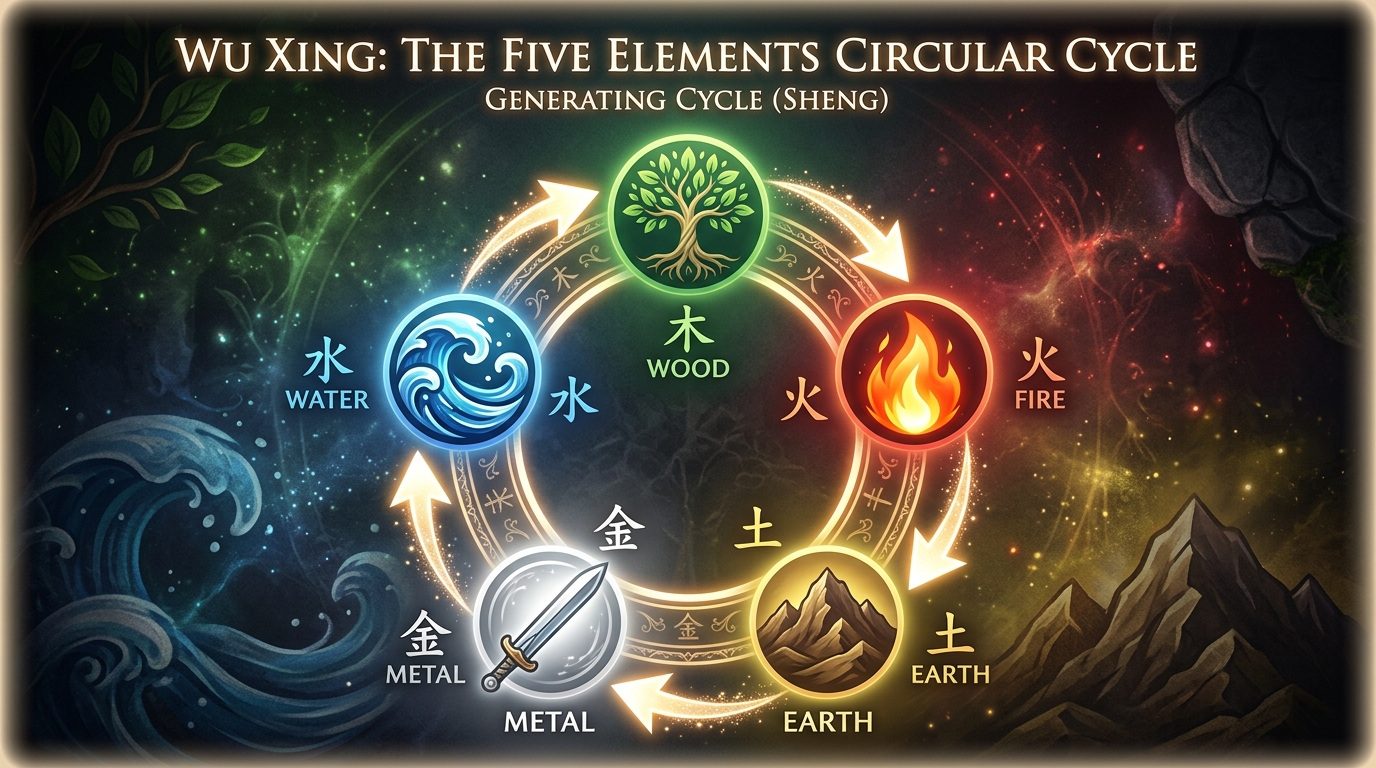 상생은 "어머니가 자식을 낳는 관계"입니다. 한 원소가 다른 원소에게 에너지를 전달하여 성장을 돕습니다. 사주에서 상생 관계는 도움, 지원, 성장을 의미합니다.
